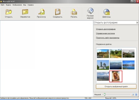 После запуска программы можно как открыть новый файл, так и выбрать один из недавних. Допустим, данный файл мы уже открывали. Его уменьшенное изображение видно в панели "недавние файлы". Выделим этот файл и нажмём кнопку "Открыть указанный файл".