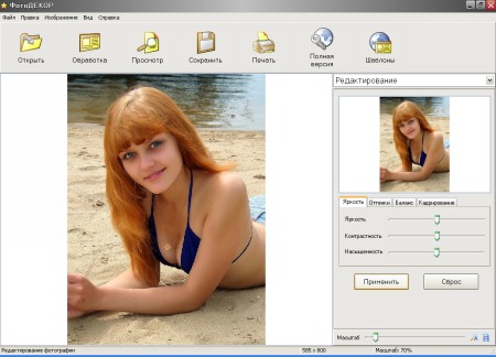 Сразу после открытия файла появляется панель редактирования. Здесь можно настроить яркость, контраст, цветовой баланс, оттенки и произвести кадрирование. Кадрирование возможно как свободное, так и с фиксированными пропорциями, что удобно для подготовки к печати без полей.