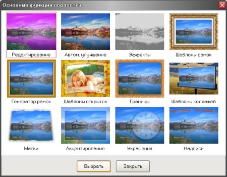 Далее откроем каталог основных функций обработки. Здесь визуально представлены все базовые возможности программы. Выбираем "Шаблоны рамок" и нажимаем кнопку "Выбрать".